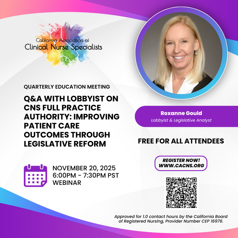 Join the CACNS Quarterly Education Meeting (QEM) for an engaging virtual Q&A session with Roxanne Gould, our lobbyist and legislative analyst, as we explore the ongoing journey toward Full Practice Authority (FPA) for California Clinical Nurse Specialists. This free session will highlight the key milestones CACNS achieved in 2025 and outline the next steps in advancing this pivotal initiative. FPA will empower California CNSs to practice to the full extent of their education and training—enhancing collaboration, improving care coordination, and driving better outcomes across healthcare settings.